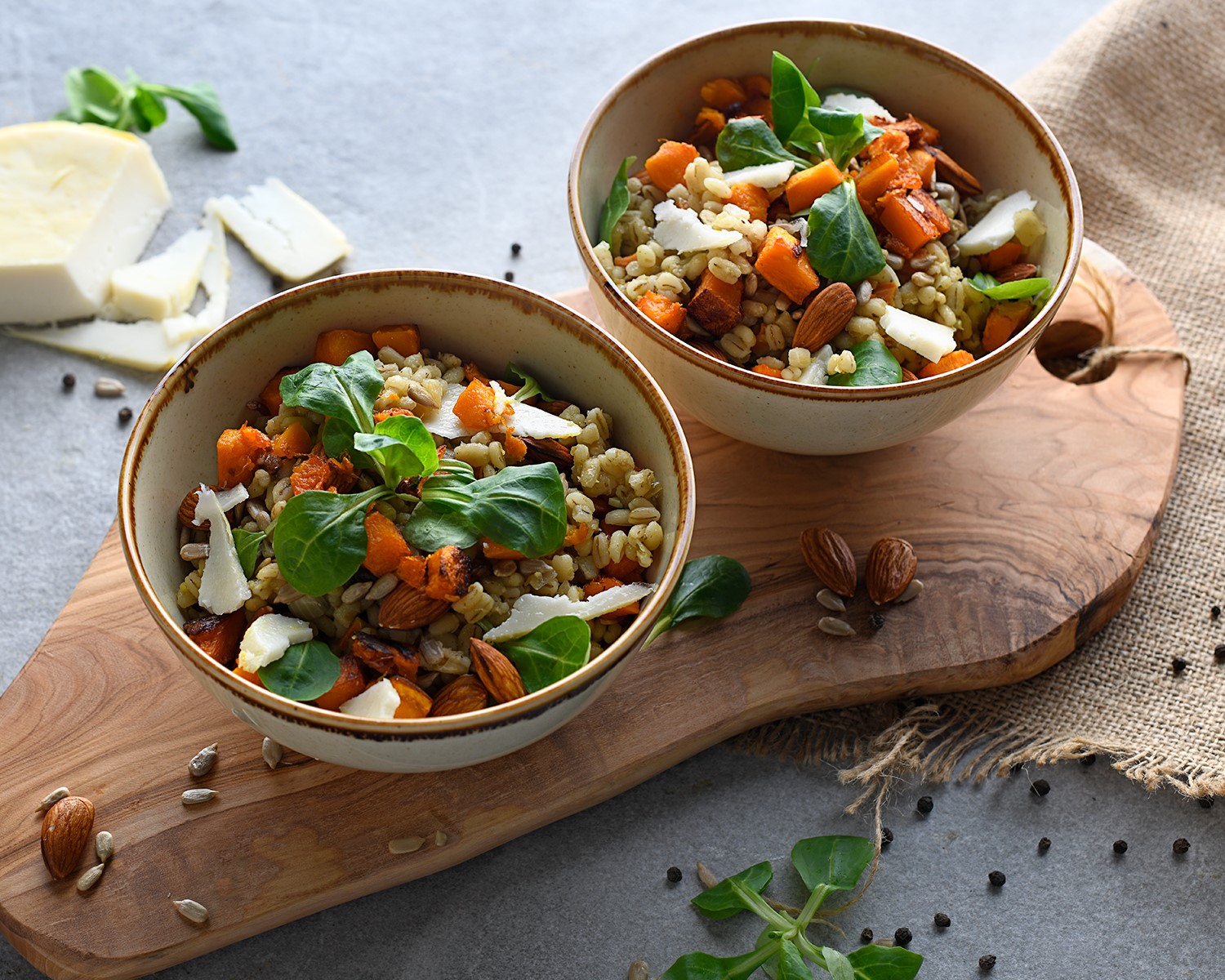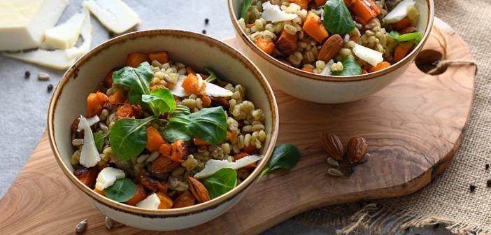 Jesienne danie: Kasza pęczak z roszponką i pieczoną dynią