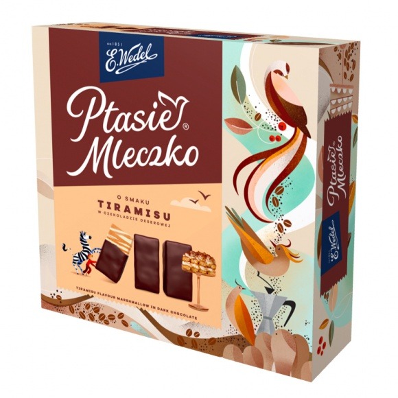 Pianki Ptasie Mleczko® o smaku Tiramisu zapakowano w kartonik o stonowanych barwach odzwierciedlających nowe nuty smakowe. Ptasi motyw, pojawiający się między ziarenkami kawy, idealnie nawiązuje do smaku tiramisu. Tak jak pozostałe opakowania kultowych pianek, nowa propozycja pudełka została zaprojektowana przez młodą polską ilustratorkę. W tym przypadku była to Jaga Sowińska. Szata graficzna została dopasowana do nowych opakowań E.Wedel. Powiększone zostało logo, a obok apetycznych pianek umieszczono symbole nawiązujące do smaku wariantu. Co więcej, na kartoniku widnieją kultowe postacie marki, chłopiec i zebra w odświeżonej wersji.