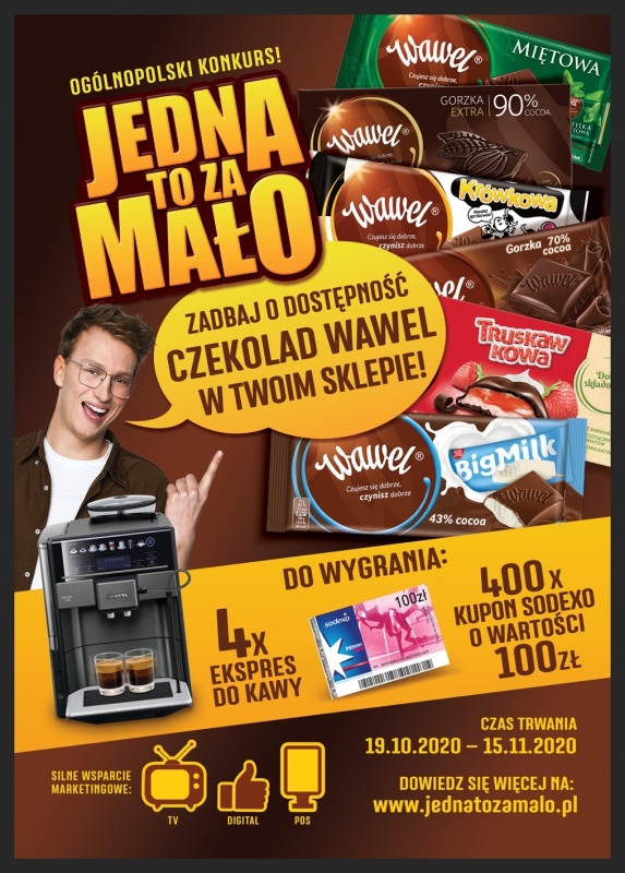 W każdym tygodniu do wygrania jest ekspres do kawy i 100 kuponów Sodexo o wartości 100 zł. Zasady są niezwykle proste. Aby wziąć udział w konkursie wystarczy kupić minimum dwie dowolne czekolady Wawel. Następnie, korzystając ze strony www.jednatozamalo.pl – napisać, którą z czekolad lubi się najbardziej i dlaczego. Konkurs trwa od 19 października do 15 listopada 2020. Aktywację wspiera silna kampania reklamowa w digitalu, zaś w punktach sprzedaży – specjalne materiały POS.