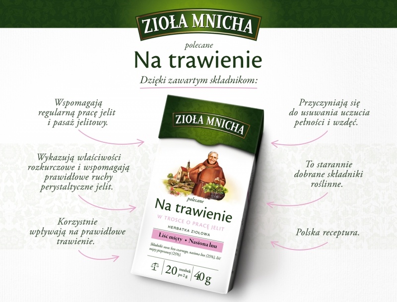 - „NA TRAWIENIE – W trosce o pracę jelit” – która dzięki zawartym w niej składnikom wspiera przewód pokarmowy, wspomaga prawidłowe trawienie i pracę jelit.