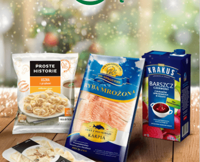 W przygotowanej przez sieć specjalnie na święta ofercie klienci znajdą także tradycyjne wigilijne potrawy, m.in. ręcznie lepione pierogi z kapustą i grzybami Szamamm (7,99zł/300g), łazanki z kapustą i grzybami Virtu (4,99zł/400g), paszteciki z kapustą i grzybami Virtu (4,99zł/400g), mrożone uszka z grzybami oraz pierogi z kapustą i grzybami Proste Historie (5,99zł/300-500g) czy barszcz czerwony Krakus (5,99zł/1l).