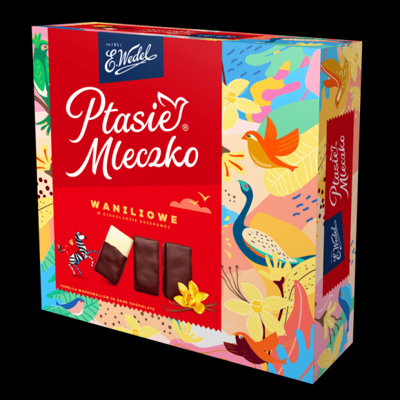 Delikatnej transformacji uległa również szata graficzna. Nowe opakowania pianek Ptasie Mleczko®bazują na ptasich wzorach, które spotkały się z ciepłym przyjęciem w 2019 roku. Tegoroczna zmiana ma na celu uspójnienie wyglądu opakowań pianek z nowym designem proponowanym w innych produktach z portfolio E.Wedel.