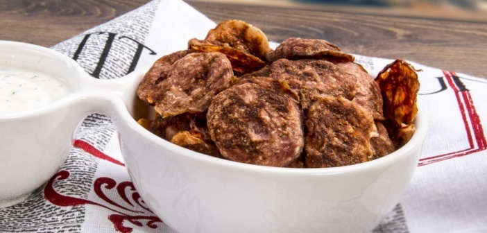 Kiełbasę krakowską kroimy w cienkie plasterki. Na dużym talerzu rozkładamy dwie warstwy ręcznika papierowego, następnie układamy plastry kiełbasy żywieckiej, kolejne przykrywamy dwiema warstwami ręcznika papierowego, a talerz wstawiamy do kuchenki mikrofalowej. Włączamy kuchenkę mikrofalową na 2-3 minuty na najwyższą moc. Opieczone chipsy przekładamy na suchy talerz lub do miseczki i serwujemy z dipem czosnkowo-jogurtowym.