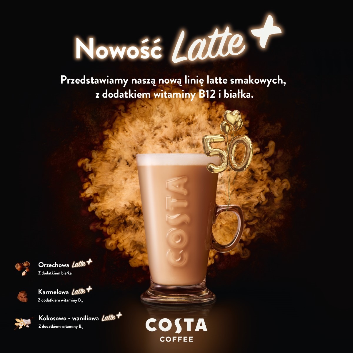 Kawa jest często pierwszym wyborem, po który sięgamy zaraz po przebudzeniu. Warto odkryć więc nowe propozycje Costa Coffee, które będą idealnym sposobem na dostarczenie naszemu organizmowi odpowiednich witamin oraz białek, które dodadzą energii na codzienne wyzwania. Linia Latte+ to trzy smakowe kawy – karmelowa i kokosowo-waniliowa, obie wzbogacone o witaminę B12 oraz orzechowa – zawierająca dodatkowe ekologiczne białko roślinne pochodzące z grochu i słonecznika. Warto wiedzieć, że jedna kawa karmelowa lub kokosowo-waniliowa wystarczy do zaspokojenia większości zalecanego dziennego spożycia witaminy B12.