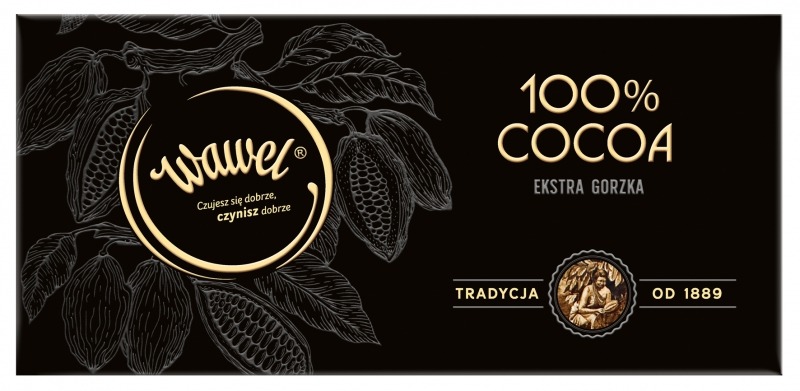 Wyjątkowość 100% cocoa Extra Gorzkiej podkreśla elegancki kartonik z atrakcyjnym designem i subtelnymi uszlachetnieniami, nawiązujący do tradycji marki Wawel – historycznego elementu grafiki z archiwalnych źródeł firmy. Co więcej, czarne opakowanie wyróżnia się na półce, kusi wzrok i podkreśla unikatowość i wysoką jakość produktu.
